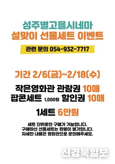 [ 신경북일보 ] 성주별고을시네마(창의문화센터 3층)는 민족 대명절 설을 맞아 2월 6일부터 2월 18일까지 ‘설맞이 선물세트 이벤트’를 진행한다.