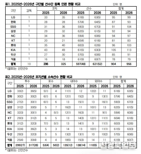 [ 신경북일보 ] KBO는 2월 10일(화) 2026년 KBO 리그 소속 선수 명단을 공시했다. 10개 구단은 총 621명의 선수를 등록해, 597명이 등록했던 2025년보다 24명이 늘어났다.
