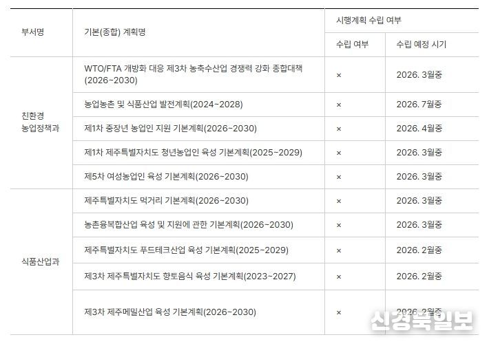 [ 신경북일보 ] 제주특별자치도의회 농수축경제위원회 한권 의원(더불어민주당/일도1·이도1·건입)은 2026년 2월 10일 개최된 제446회 임시회 농축산식품국 주요업무보고 회의에서, “5년 단위 기본(종합)계획에 의거하여 매해 연도별로 수립되어야 하는 각종 시행계획들이 연초에 제때 수립되지 못함으로서, 의회가 계획의 적정성을 확인하지 못하고, ‘계획도 없이 집행’부터 하는 상황이 초래되고 있어, 개선이 시급하다”고 지적했다.