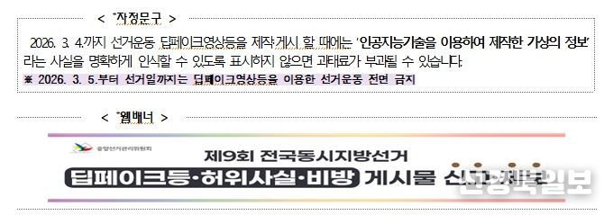 포털사 뉴스 댓글창, 인터넷 커뮤니티, AI사 홈페이지 등에'공직선거법'안내 자정문구를 표출하여 온라인 자율 규제 유도를 통해 위법행위를 사전에 예방하는 한편,주요 포털사와 인터넷 커뮤니티 홈페이지 등에 웹배너를 게시하여 위법게시물 신고·제보도 활성화한다.