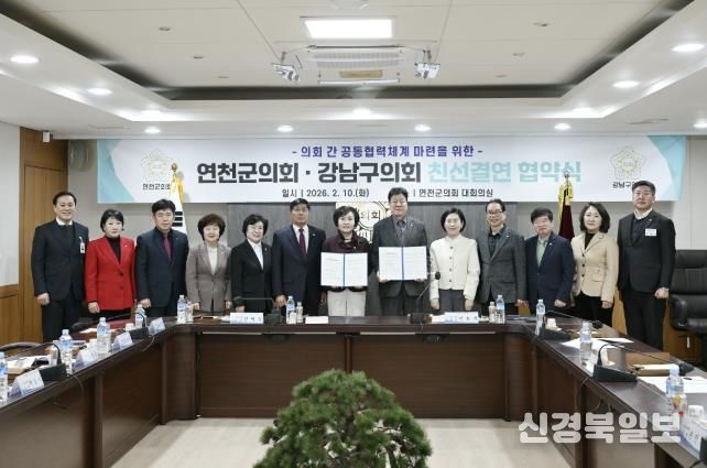 [ 신경북일보 ] 연천군의회와 서울시 강남구의회는 2026년 2월 10일 연천군의회 대회의실에서 친선결연식을 개최하고, 양 의회 간 우호 증진과 상호 협력을 위한 친선결연 협약식을 체결했다.