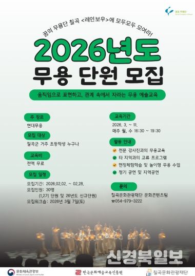 [ 신경북일보 ] (재)칠곡문화관광재단(이사장 김재욱)은 2025 꿈의 무용단, ‘칠곡’ '레인보우' 단원을 모집한다.