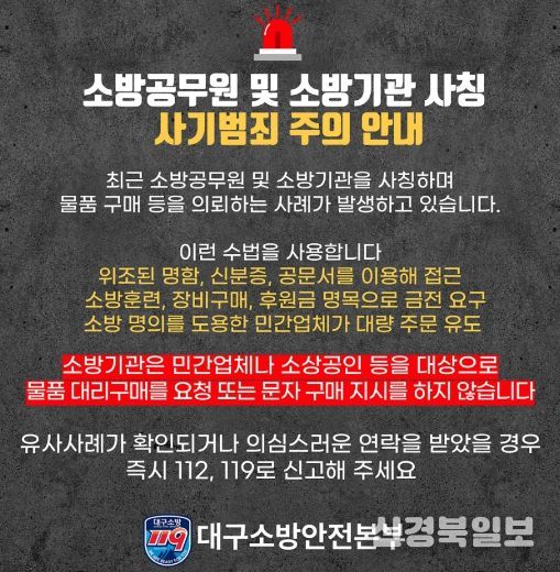 [ 신경북일보 ] 대구소방안전본부는 최근 소방공무원과 소방기관을 사칭해 물품 구매나 계약 체결을 유도하는 사기 범죄가 잇따르고 있다며 시민과 업체에 각별한 주의를 당부했다.
