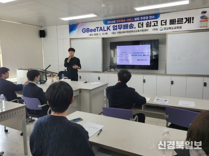 [ 신경북일보 ] 경북교육청은 12일 안동시에 있는 안동교육지원청 학교교육지원센터 대회의실에서 도내 학교지원센터 담당 장학사, 업무 배송 주무관, 업무 배송 팀장 등 약 80명을 대상으로‘2026 모두를 위한 업무 배송 서비스 운영자 연수’를 개최했다고 밝혔다.