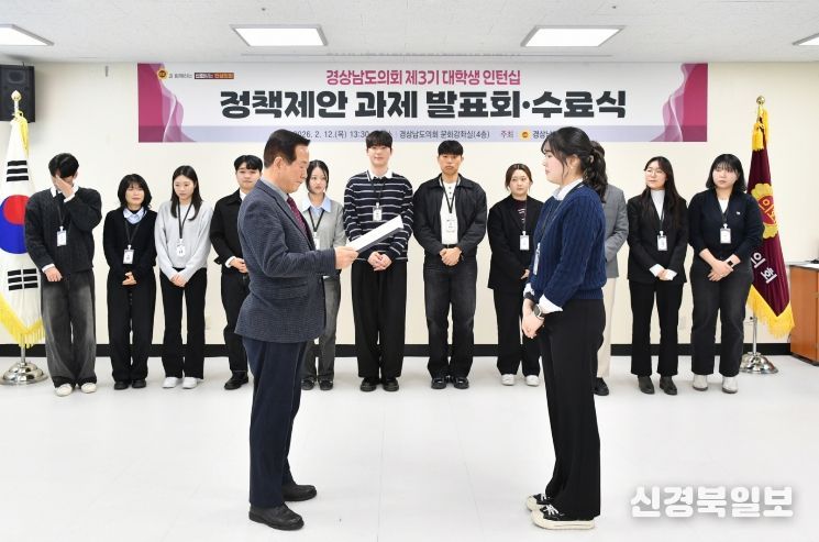 [ 신경북일보 ] 경상남도의회는 2월 12일 도의회 문화강좌실에서 ‘제3기 대학생 인턴십 정책제안 과제 발표회 및 수료식’을 개최하고, 6주간의 대학생 인턴십 사업을 성공적으로 마무리했다고 밝혔다.