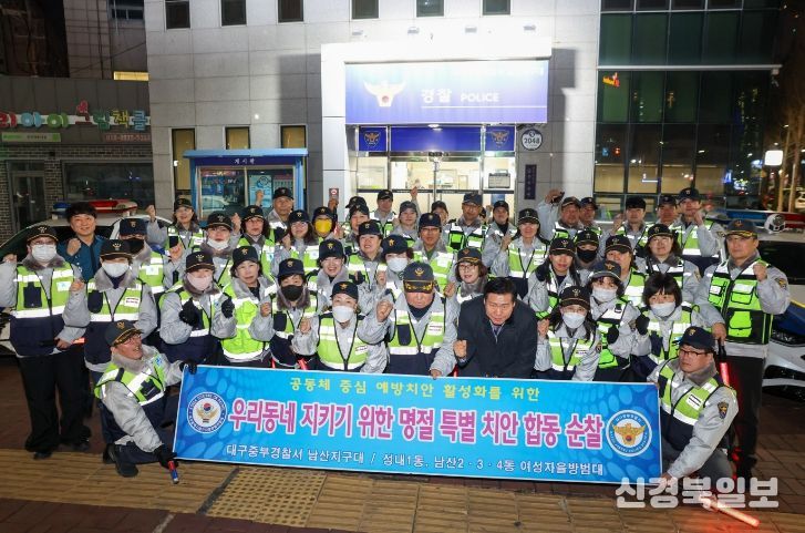 [ 신경북일보 ] 대구중구자율방범연합대(대장 심형주)는 지난 12일 설 명절을 앞두고 지역 치안과 주민 안전을 강화하기 위해 남산지구대와 함께 설맞이 합동순찰을 실시했다.