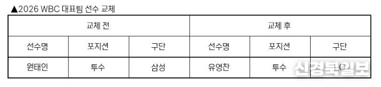[ 신경북일보 ] KBO 전력강화위원회는 부상으로 인해 WBC 참가가 어려워진 삼성 원태인을 대체할 선수로 LG 유영찬을 확정하고 WBC 조직위에 선수 교체 승인을 요청했다.