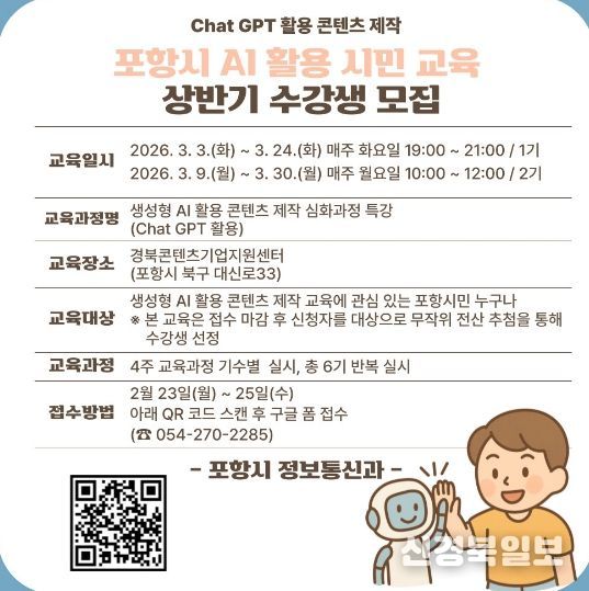[ 신경북일보 ] 포항시는 지난해 시민들로부터 큰 호응을 얻었던 ‘생성형 AI 활용 콘텐츠 제작 특강’을 올해도 정규 편성하고, 오는 23일부터 2026년도 상반기(1·2기) 수강생을 모집한다.