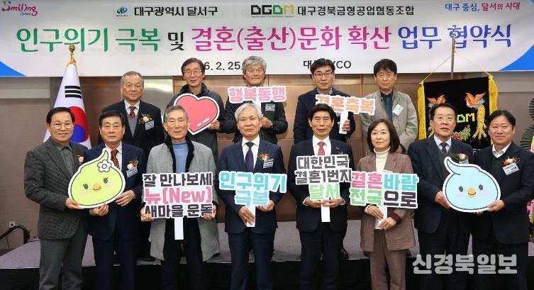 [ 신경북일보 ] 대구 달서구는 25일 EXCO에서 대구경북금형공업협동조합(이사장 박만희)과 인구위기 극복 및 결혼·출산문화 확산을 위한 업무협약을 체결했다.