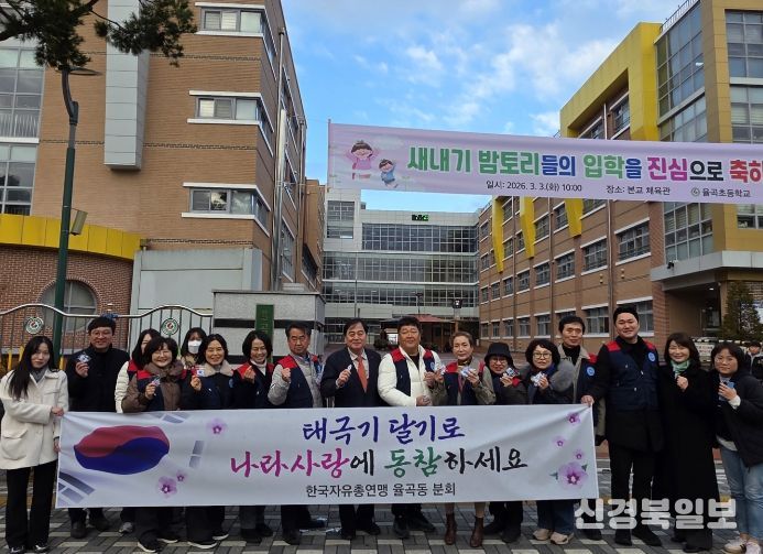 [ 신경북일보 ] 한국자유총연맹 율곡동위원회가 율곡초등학교에서 새 학기를 맞은 학생들에게 태극기 키링을 나눠주며 애국심을 강조하는 행사를 진행했다.