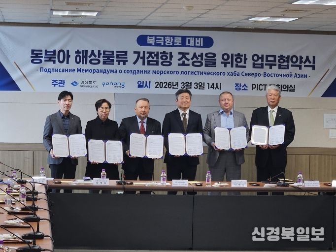 [ 신경북일보 ] 경상북도는 2026년 3월 3일 포항영일신항만 주식회사(PICT) 대회의실에서 북극항로 시대를 대비해 영일만항이 동북아 해상물류 거점항만으로 발돋움하기 위한 다자간 업무협약을 체결했다.
