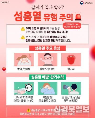 현재 성홍열을 예방할 수 있는 백신은 없어 개인위생 관리가 중요하다. 북구보건소는 비누를 사용해 30초 이상 손을 씻고, 기침이나 재채기 시 휴지나 옷소매로 입과 코를 가리며, 발열이나 호흡기 증상이 있을 때는 반드시 마스크를 착용하고, 아이들이 자주 만지는 장난감과 교구를 철저히 소독할 것을 강조했다.
