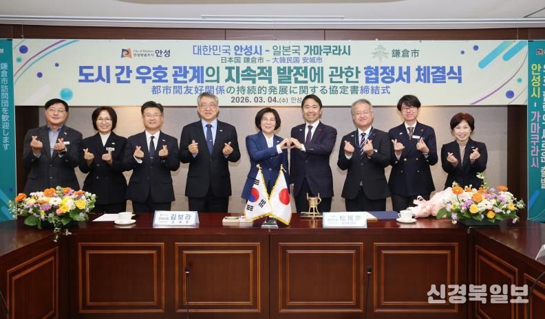 [ 신경북일보 ] 안성시는 2026년 3월 4일 오전 11시 안성시청 본관 2층 상황실에서 일본 가나가와현 가마쿠라시(시장 마쓰오 다카시)와 '도시 간 우호 관계의 지속적 발전에 대한 협정'을 체결하고 양 도시 간 문화·예술 및 청소년 분야 교류를 본격 추진하기로 했다.