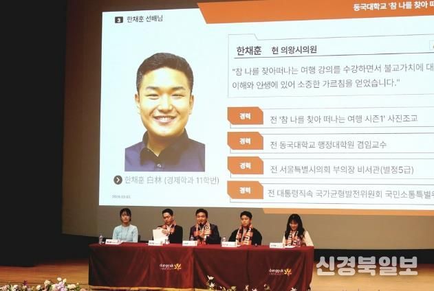 [ 신경북일보 ] 한채훈 의왕시의회 의원이 지난 3일 오후 모교인 동국대학교에서 열린 건학 120주년 기념 특별 강좌 ‘참 나를 찾아 떠나는 여행’의 첫 번째 멘토로 나서 420여 명의 후배들에게 도전과 희망의 메시지를 전했다.