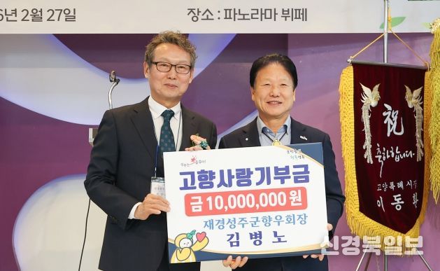 기부금 전달은 지난달 27일 서울 종로구에서 개최된 '2026년 재경성주군향우회 신년 교례회' 자리에서 이뤄졌다. 김병노 회장은 현재 재경성주군향우회장으로서 향우들의 단합을 이끌고 있으며, 평소 고향 성주에 대한 각별한 애정을 바탕으로 다양한 지원을 이어온 것으로 알려졌다.