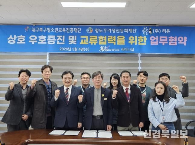 [ 신경북일보 ] 대구북구청소년교육진흥재단과 청도우리정신문화재단이 2026년 3월 4일 오후 1시에 청소년 교류와 협력을 위한 업무협약을 체결했다.