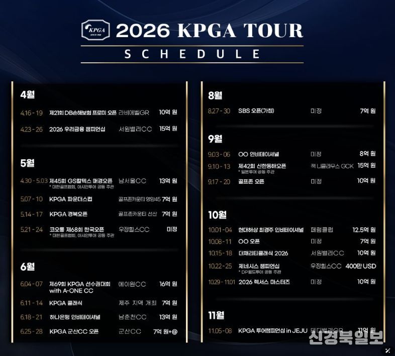 [ 신경북일보 ] ㈜한국프로골프투어(대표이사 김원섭, 이하 KPGT)가 3월 5일, 2026 시즌 KPGA 투어 일정을 발표했다.