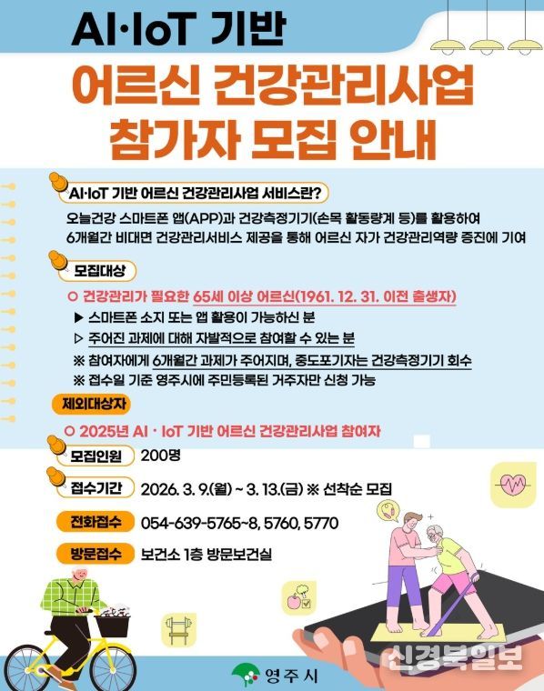 [ 신경북일보 ] 영주시는 오는 3월 9일부터 13일까지 ‘2026년 AI·IoT 어르신 건강관리사업’ 신규 참여자 200명을 선착순 모집한다.