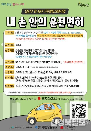 [ 신경북일보 ] 달서구는 경제적으로 어려움을 겪는 청·장년층의 구직활동을 돕기 위해 3월부터 '내 손 안의 운전면허' 사업을 시작한다.
