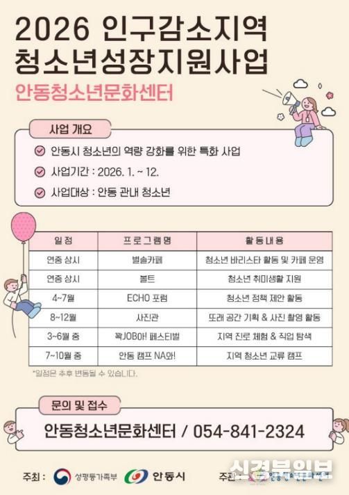 [ 신경북일보 ] 안동청소년문화센터가 지난해에 이어 2년 연속으로 인구감소지역 청소년을 위한 성장지원사업을 진행한다.