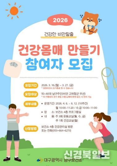 [ 신경북일보 ] 대구 남구보건소가 4월부터 지역 주민을 대상으로 비만 예방과 신체활동 증진을 위한 '2026년 비만탈출! 건강몸매 만들기 교실'을 운영한다.