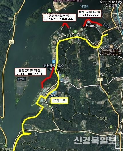 통행 제한 구간은 △의암공원~KT&G 상상마당(0.45㎞) △삼천동 구 중도선착장~중도물레길 입구(0.37㎞) △삼악산호수케이블카~송암스포츠타운(0.8㎞) 등 3곳이다. 통행 제한 기간은 구간별로 다르다. 의암공원~KT&G 상상마당 구간은 11일부터 20일까지, 삼천동 구 중도선착장~중도물레길 입구 구간은 13일부터 20일까지, 삼악산호수케이블카~송암스포츠타운 구간은 11일부터 31일까지 통행이 제한된다. 공사 여건에 따라 통행 제한 기간은 일부 조정될 수 있다.
