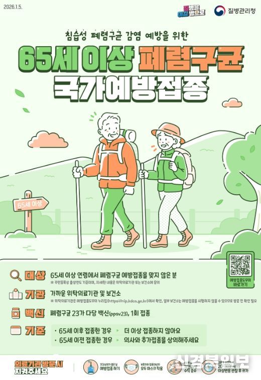 65세 이상 어르신은 평생 한 번의 폐렴구균 예방접종으로 감염과 합병증을 예방할 수 있다. 무료 접종 대상은 1961년 12월 31일 이전 출생자 중 폐렴구균 23가 다당백신(PPSV23)을 맞지 않은 이들이다. 대상자는 신분증을 지참해 보건소, 보건지소 또는 지정된 전국 위탁의료기관에서 접종을 받을 수 있다.