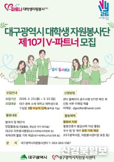 [ 신경북일보 ] 대구광역시와 대구광역시자원봉사센터가 지역 내 대학생 자원봉사 활성화를 위해 '제10기 V-파트너 대학생 자원봉사단'을 모집한다. 신청 접수는 3월 22일까지 진행된다.