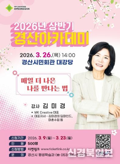 [ 신경북일보 ] 경산시는 26일 경산시민회관 대강당에서 '2026년 상반기 경산아카데미'를 연다. 이번 행사에서는 MK Creatice의 김미경 대표가 '매일 더 나은 나를 만나는 법'을 주제로 강연을 진행한다.