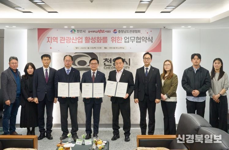 천안시는 12일 시청 제1소회의실에서 호서대학교 RISE사업단, 충남관광협회와 ‘지역 관광산업 활성화를 위한 업무협약’을 체결했다.