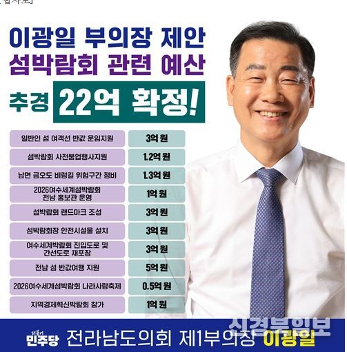 [ 신경북일보 ] 전라남도의회 이광일 제1부의장은 12일 열린 전라남도의회 본회의에서 2026여수세계섬박람회 관련 추가경정예산 22억 원이 최종 확정됐다고 밝혔다.