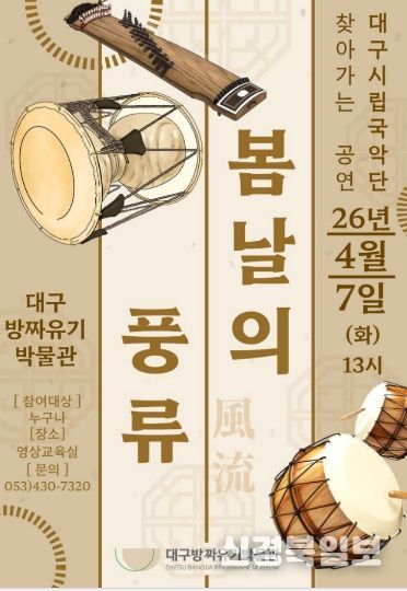 대구문화예술진흥원 박물관운영본부 산하 대구방짜유기박물관은 3월 24일 오후 2시에 '탁본자료로 만나는 팔공산 역사문화 깊이' 특강을, 4월 7일 오후 1시에는 대구시립국악단이 참여하는 '봄날의 풍류' 공연을 각각 개최한다. 박물관은 전국에서 유일하게 방짜유기를 전문으로 다루며, 전통 금속공예와 팔공산국립공원의 문화유산을 알리는 데 주력하고 있다.
