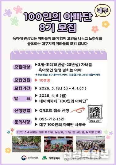 [ 신경북일보 ] 대구광역시는 아버지들의 육아 참여를 장려하고 가족 중심의 양육 문화를 확산하기 위해 ‘2026년 제8기 대구 100인의 아빠단’ 단원을 3월 18일부터 모집한다.