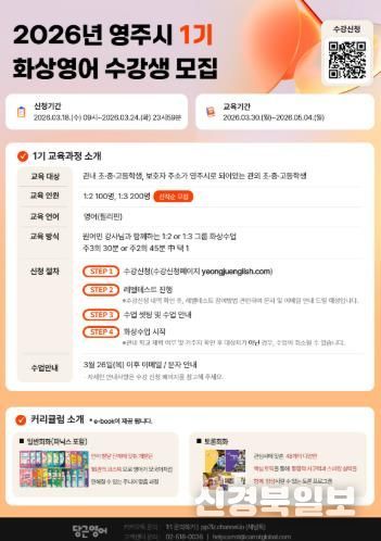 [ 신경북일보 ] 영주시는 지역 내 학생들의 영어 회화 능력 증진과 국제적 소양 함양을 목적으로 ‘2026년 원어민 사이버 화상영어’ 1기 수강생을 모집한다.