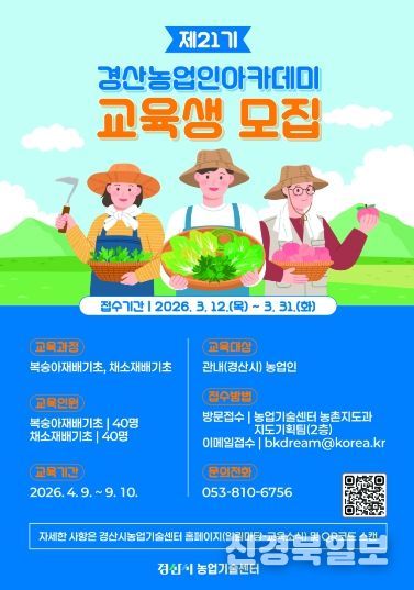 [ 신경북일보 ] 경산시가 제21기 경산 농업인 아카데미 교육생을 모집한다. 이번 모집은 복숭아와 채소 재배 기초 과정으로, 각 과정별로 40명을 선발한다.
