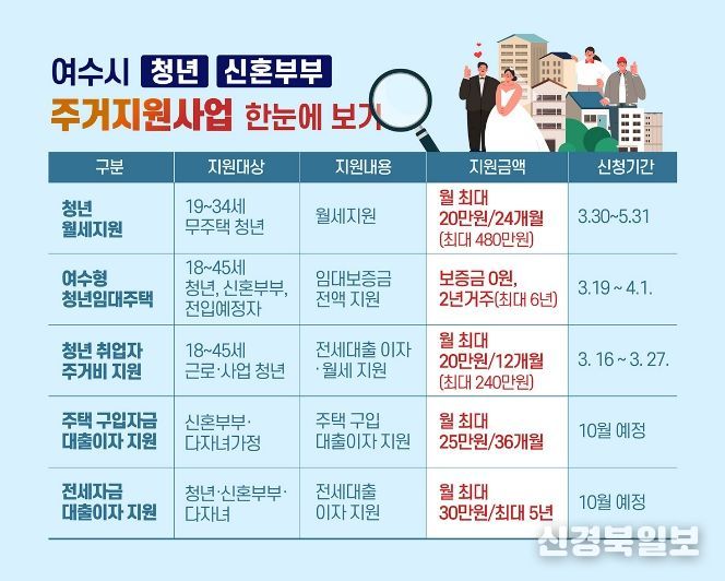 [ 신경북일보 ] 여수시가 청년과 신혼부부, 다자녀 가구의 주거비 부담을 줄이고 안정적 정착을 돕기 위해 45억 원을 투입, ‘주거지원 5종 패키지’를 추진한다.
