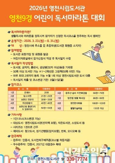 [ 신경북일보 ] 영천시 평생학습관은 초등학생들의 책 읽기 습관을 장려하기 위해 3월 23일부터 8월 31일까지 '영천9경 어린이 독서마라톤 대회'를 진행한다.