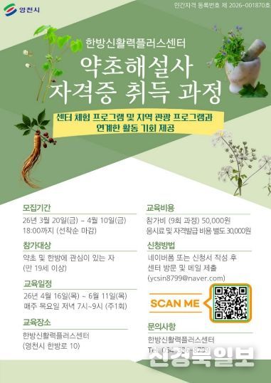 [ 신경북일보 ] 영천시가 한방신활력플러스센터(영천시 한방로 10)에서 약초해설사 자격증 취득 과정을 마련하고 교육생을 모집한다.