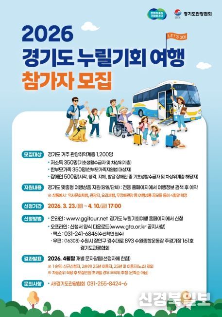 [ 신경북일보 ] 경기도가 3월 23일부터 4월 10일까지 관광취약계층의 무료 여행을 지원하는 ‘경기도누릴기회여행’ 참여자 1,200명을 모집한다.