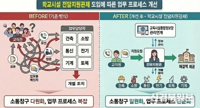 [ 신경북일보 ] 경북교육청은 학교 시설 업무의 전문성과 효율성을 높이고 현장 중심의 신속한 지원 체계를 구축하기 위해 3월부터 학교와 기술직 공무원을 1대 1로 매칭해 전담 지원하는 ‘학교 시설 전담지원관제’를 본격 시행한다고 20일 밝혔다.