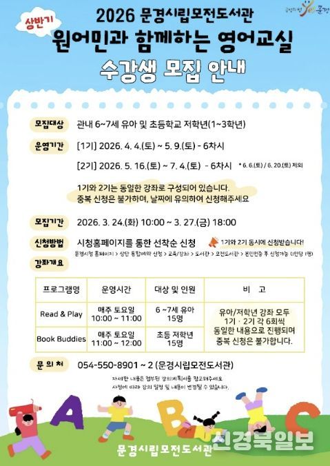 [ 신경북일보 ] 문경시립모전도서관이 4월 4일부터 7월 4일까지 매주 토요일에 '원어민과 함께하는 영어교실'을 상반기 프로그램으로 마련한다.
