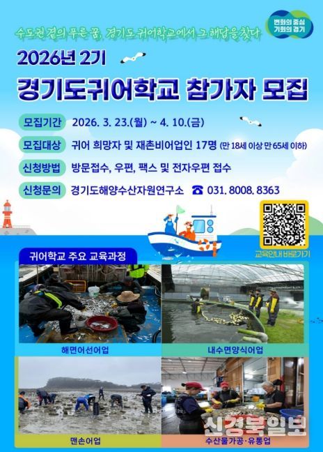 [ 신경북일보 ] 경기도해양수산자원연구소는 귀어 희망자의 어촌 정착을 지원하기 위해 4월 10일까지 ‘2026년 2기 귀어학교’ 교육 프로그램 참가자를 모집한다.