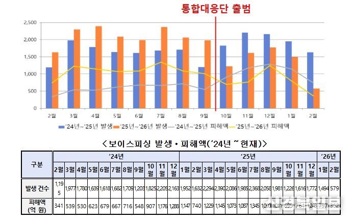 특히, 보이스피싱은 통상적으로 매년 4분기에 이전 분기보다 크게 증가하는 경향이 있었으나(’24년 ㅿ3분기 4,594건 → ㅿ4분기 6,193건, 34.8%↑), 통합대응단이 출범한 ’25년 4분기에는 오히려 이전 3분기보다 27.9% 감소(’25년 ㅿ3분기 6,407건 → ㅿ4분기 4,614건) 하여 ‘연말 피싱 특수’를 처음으로 억제했으며, 통합대응단 체계가 안착한 ’26년 2월에는 전년 동월 대비 발생 건수가 무려 64.5%(1,632건→579건) 감소했다.