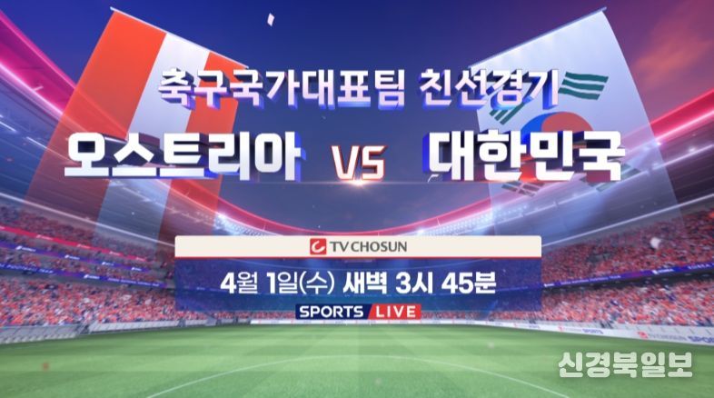 [ 신경북일보 ] '대한민국 축구대표팀 경기 주관 방송사'인 TV CHOSUN이 4월 1일(수) 새벽 3시 45분부터 축구 국가대표팀 친선경기 '대한민국 vs 오스트리아'를 생중계한다.