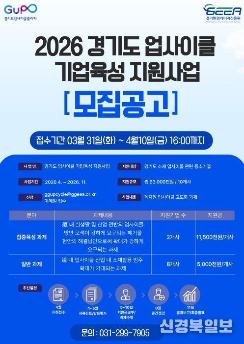 [ 신경북일보 ] 경기환경에너지진흥원이 업사이클 기업을 발굴해 기술 고도화와 사업화를 돕는 ‘경기도 업사이클 기업육성 지원사업’ 참여기업을 10일까지 모집한다.