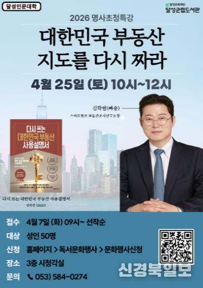 [ 신경북일보 ] 달성군립도서관이 부동산 전문가 김학렬 스마트튜브 부동산조사연구소장을 초청해 인문학 특강을 진행한다.