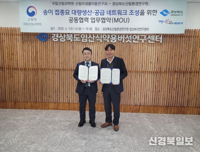 [ 신경북일보 ] 경상북도산림환경연구원은 임산식약용버섯연구센터에서 1일 산림청 국립산림과학원과 ‘송이 접종묘 대량생산·공급 네트워크 조성’을 위한 업무협약(MoU)을 체결했다.