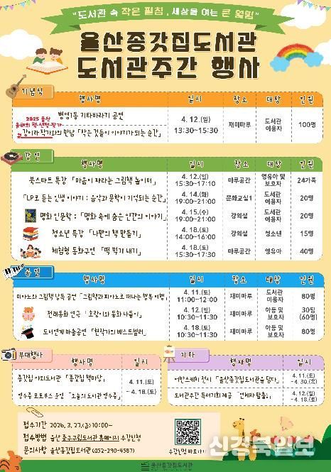 [ 신경북일보 ] 울산 중구가 제62회 도서관의 날·도서관 주간(4. 12.~4. 18.)을 맞아 4월 11일부터 4월 18일까지 지역 내 도서관 10곳에서 ‘2026년 도서관의 날·도서관 주간 행사’를 개최한다.