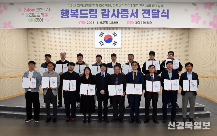 [ 신경북일보 ] 김제시는 6일 시청 대회의실에서 ‘다자녀가정⇔기업․단체 행복드림 매칭사업’에 참여한 후원업체 대표 및 관계자들을 초청해 감사증서를 전달했다고 밝혔다.