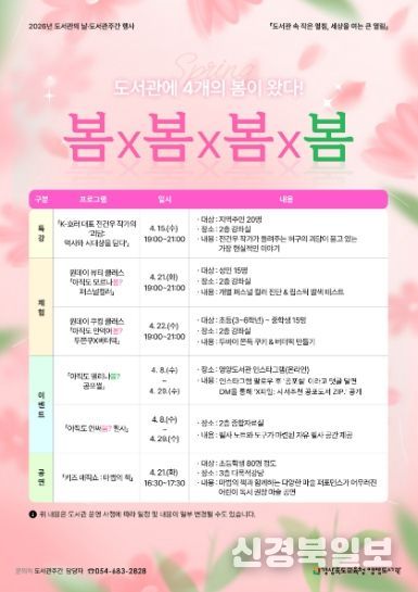 [ 신경북일보 ] 경상북도교육청 영양도서관은 2026년 도서관의 날·도서관주간을 맞아 ‘도서관 속 작은 펼침, 세상을 여는 큰 열림’을 공식 표어로 지역주민을 위한 강연, 체험, 공연, 이벤트를 운영한다.